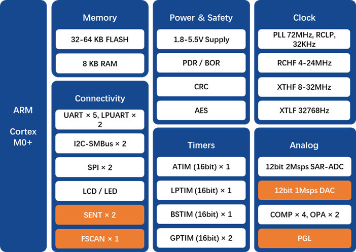 FM33LF0xx系列是复旦微推出的基于ARM Cortex-M0+内核的32位低功耗MCU芯片,最高主频72MHz,最大支持64KB FLASH和8KB RAM,集成LCD驱动、LED驱动、带温补的RTC、ADC、DAC、OPA、COMP、AES、UART、LPUART、I2C-SMBus、SPI、CAN、SENT等通用外设接口,支持LQFP64/48/32、QFN32多种封装。