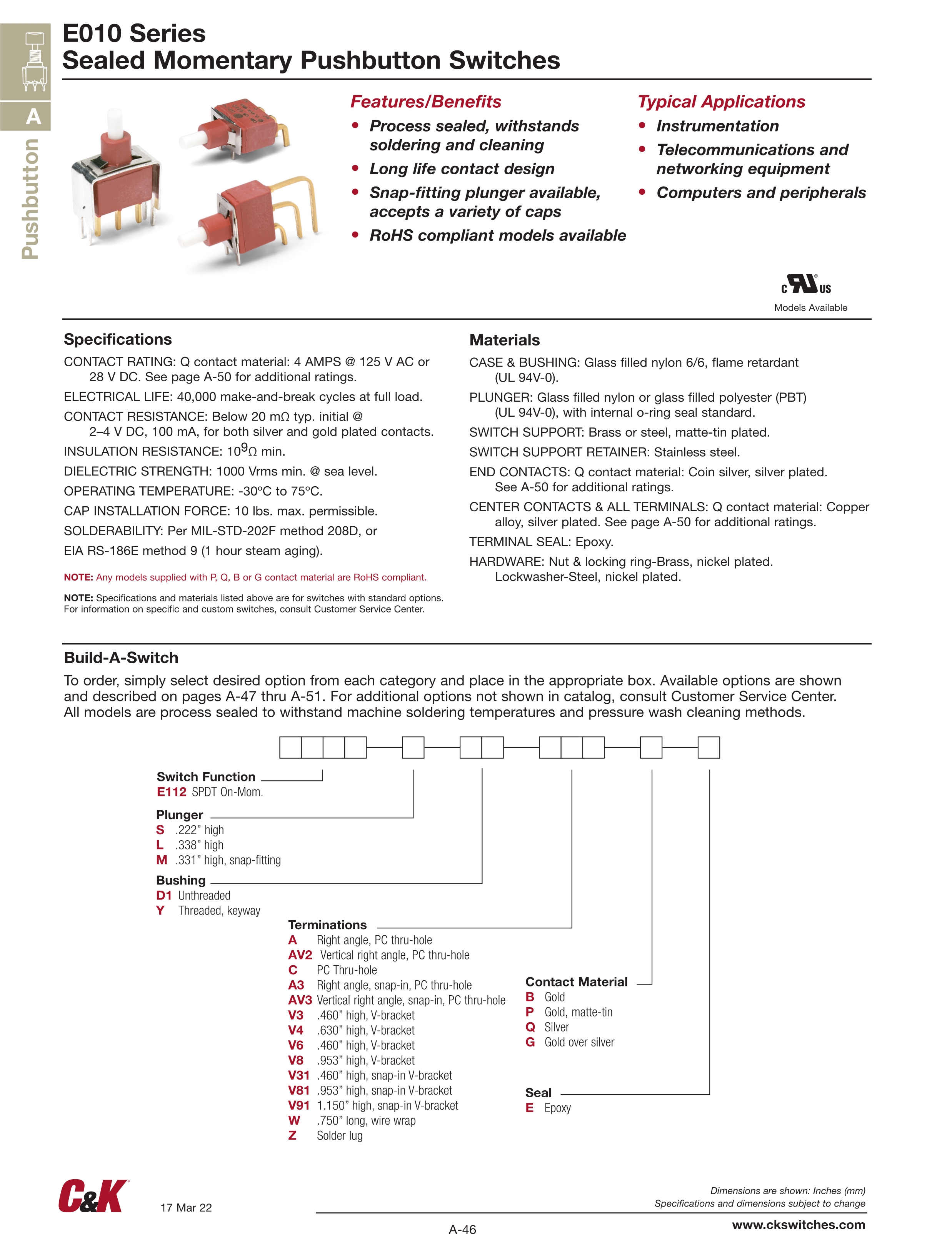 C&K按动开关E010系列