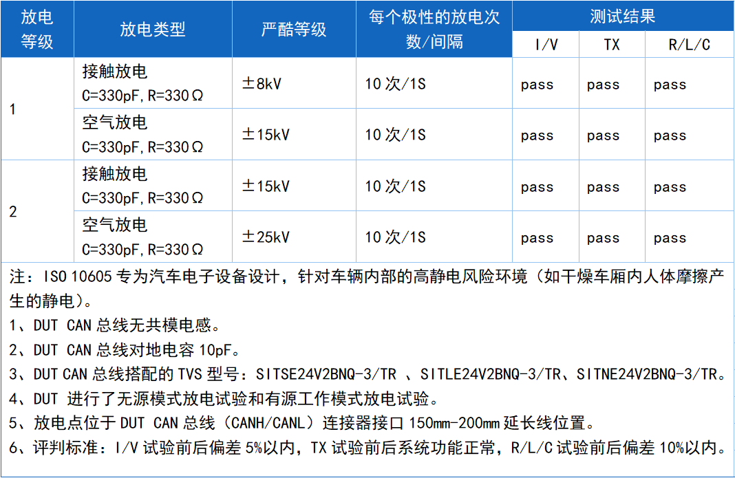 搭配SIT1044GQ的DUT在总线无共模电感滤波的情况下按照ISO 10605标准的静电测试如下表: