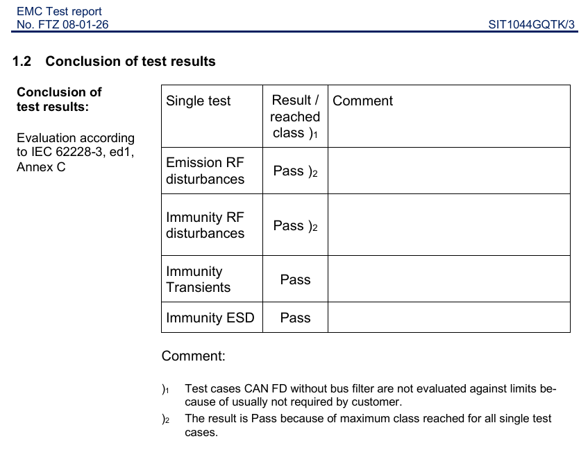 随着汽车智能化、电动化升级,整车电子模块数量激增,电磁环境愈发复杂,对核心器件的EMC性能要求更为严苛。SIT1044GQ凭借卓越的芯片设计,全面通过了IBEE/FTZ-Zwickau测试认证,符合IEC62228-3和VW80121-3各项标准规范。涵盖四大核心测试维度,全面覆盖车载场景电磁辐射风险,在抗干扰功率、瞬态防护,ESD防护等关键指标上设置更高阈值,充分验证芯片在复杂车载环境中的稳定性。